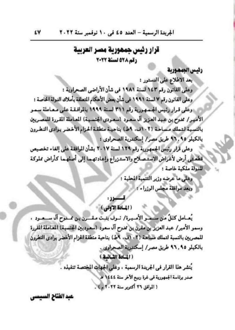 صورة من القرار بالجريدة كشف تفاصيل القرار، بمنح الأميرة السعودية المذكورة وشقيقها قطعة أرض على الطريق الصحراوي في مصر.