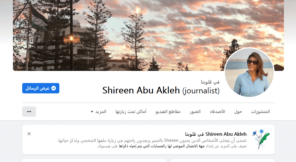 وبحسب ما رصدته “وطن” فور الدخول لحساب الشهيدة شيـرين أبو عاقلة، فقد وضع “فيسبوك” عبارة “في قلوبنا” بجانب اسم المعرف الشخصي بها.
