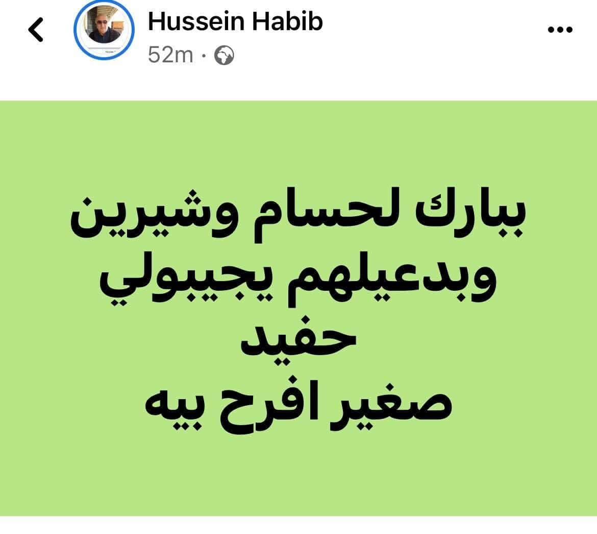 حيث كتب حسين حبيب عبر حسابه على “فيسبوك”: “ببارك لحسام وشيرين وبدعيلهم يجيبولي حفيد صغير افرح بيه”.