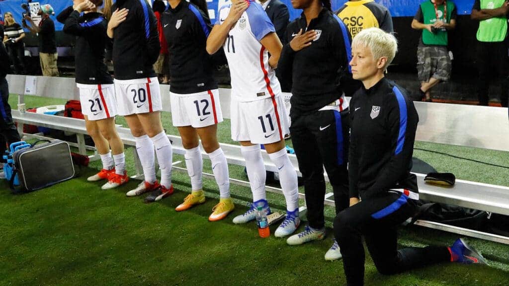 كما تم إرساء على هذا القرار والتوصل إليه. بعدما قامت نجمة المنتخب الأمريكي “ميجان رابينوي” 35 عاماً، بالركوع مباشرة على ركبة واحدة في مباراة دولية ودية عام 2016م. جمعت الفريق تضامناً مع مواطنها “كولن كابرنيك” اللاعب السابق لنادي سان فرانسيسكو لكرة القدم الأمريكية.