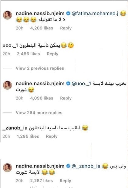 لكن نادين ردّت على احد المتابعين علّق على صورتها: “يمكن ناسية البنطلون”، بقولها: “يخرب بيتك لابسة شورت”.