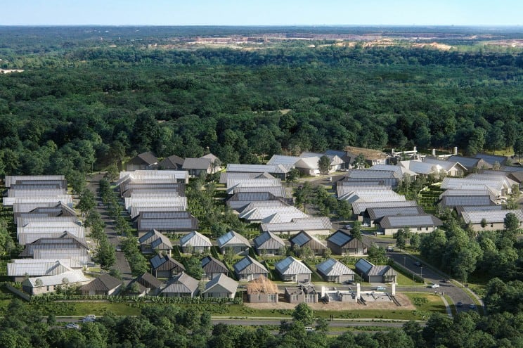 تُظهر التصورات الرقمية لتطوير الحي صفوفًا من العقارات مع أسقف مغطاة بألواح شمسية. ومن المتوقع أن يستغرق بناء كل منزل أسبوعًا.