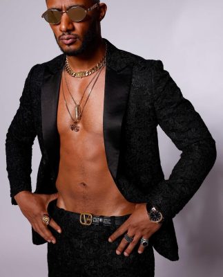 بينما ظهر بنفس الوضعيات الغريبة ببدلة سوداء، واستعرض جسده العاري مرة أخرى.