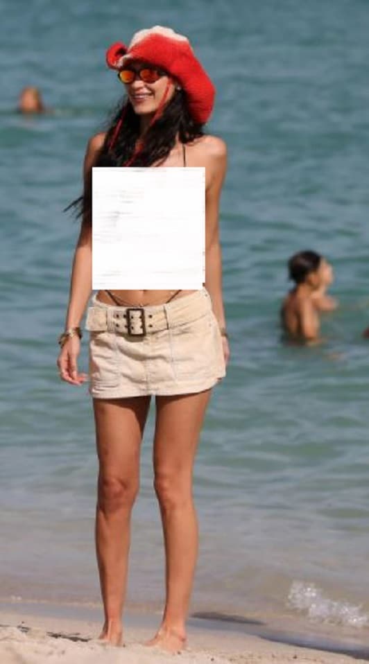 بعد الحفل، استمتعت عارضة الأزياء بقضاء يوم على الشاطئ مرتدية تنورة قصيرة تحمل علامة Abercrombie & Fitch – وهي علامة تجارية ستكون مألوفة لأي شخص عاش في تسعينيات القرن الماضي ومطلع هذه الألفية.