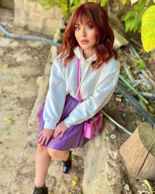 حيث ارتدت شقيقة الفنانة ديانا كرزون تيشرت واسع، باللون البيج، مع تنورة قصيرة “ميني جيب”، باللون البنفسجي.