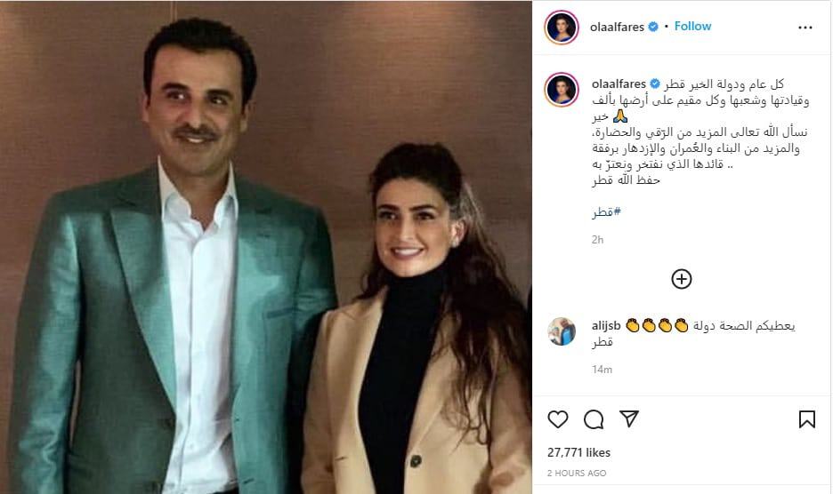 ونشرت علا الفارس عبر حسابها في انستغرام، صورة جمعتها بأمير قطر الشيخ تميم بن حمد آل ثاني، وأرفقتها بتهنئة قالت فيها: “كل عام ودولة الخير قطر وقيادتها وشعبها وكل مقيم على أرضها بألف خير . نسأل الله تعالى المزيد من الرّقي والحضارة. والمزيد من البناء والعمران والإزدهار برفقة قائدها الذي نفتخر ونعتزّ به . حفظ الله قطر”.