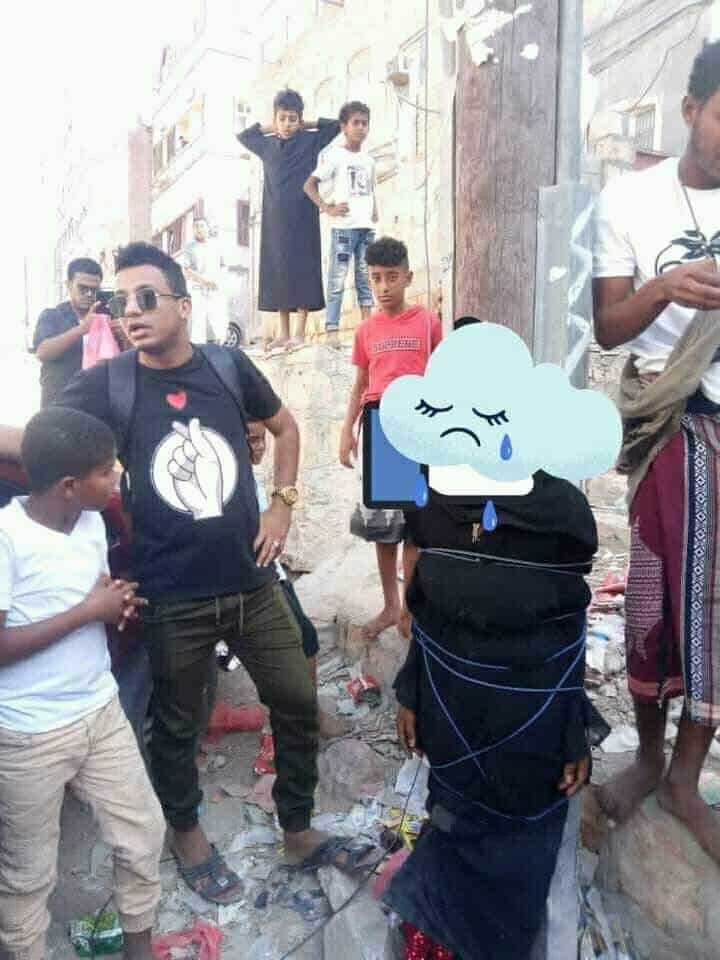 وتظهر المُسنة اليمنية في الصورة وهي في حالة صحية متدهورة، ومصلوبة، بينما يتجمهر حولها شباب التقطوا الصور. دون مراعاة لسنها وحالها الذي يرثى له.