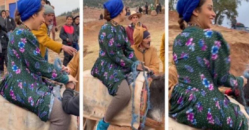 وكانت بلقيس تتمايل على أنغام الموسيقى الشعبية المغربية. وسط ضحكات الحضور النساء من طاقم العمل الذي شاركوها الرقص.