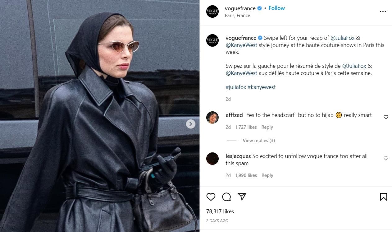 ونشر حساب المجلة على انستغرام صور للممثلة جوليا فوكس الحبيبة الجديدة لمغني الراب كاني ويست بعد انفصال النجمة كيم كارداشيان عنه، حيث ظهرت “فوكس” وهي ترتدي وشاحًا أسود مربوطًا حول رأسها، مع عبارة: “نعم للحجاب”.