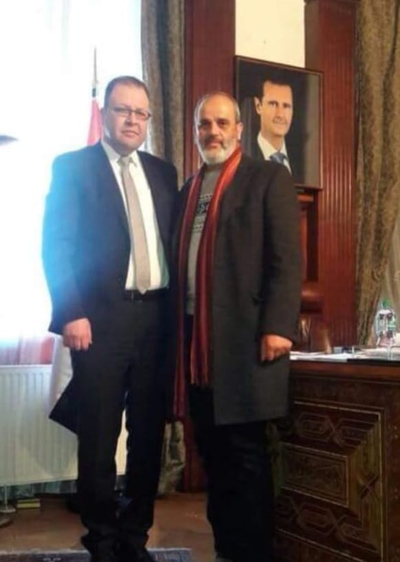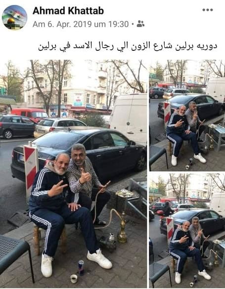 وكتب فوق صورة جمعته مع صاحب محل بيسان “عمر حيات” عبارة “دورية برلين شارع الزون إلى رجال الأسد في برلين”.