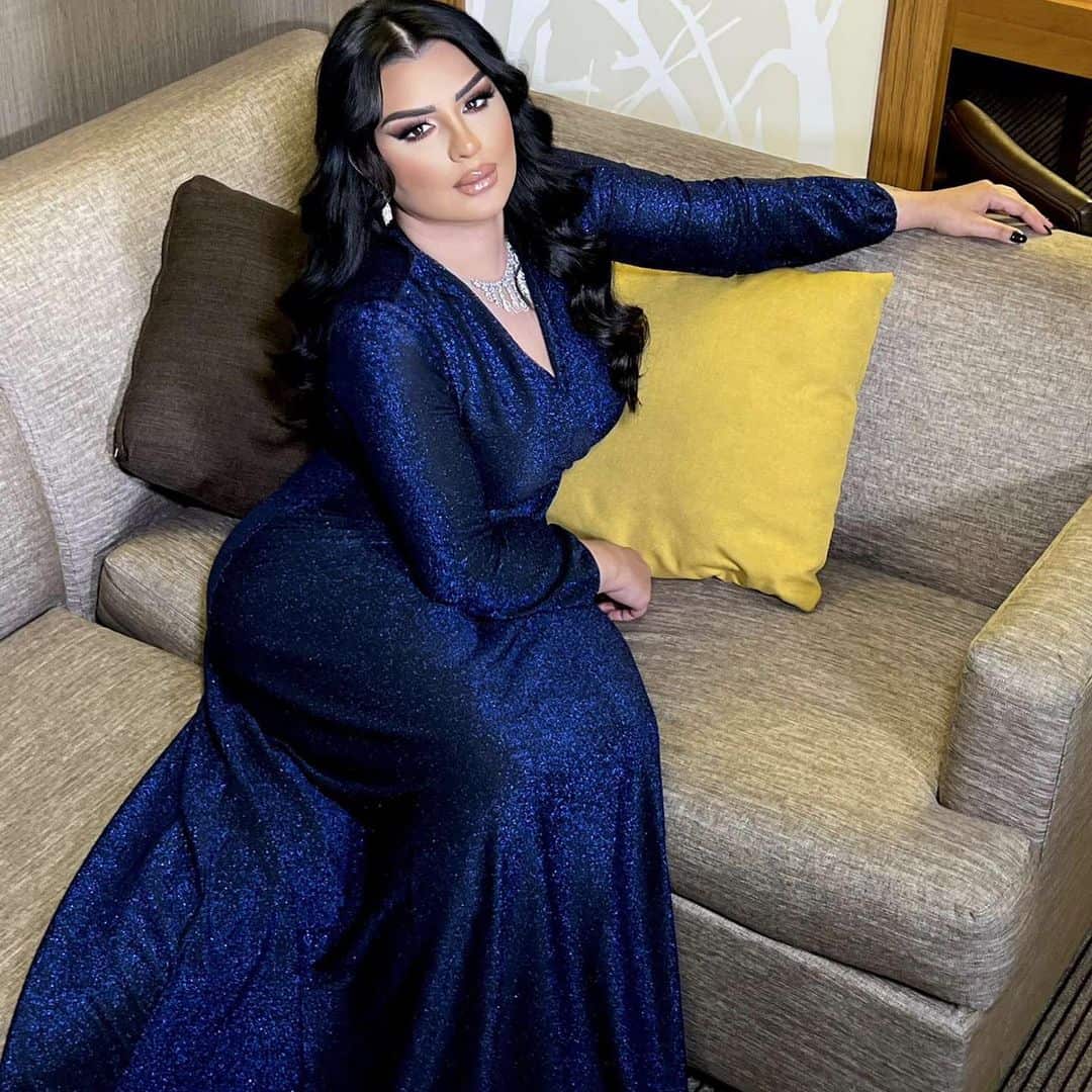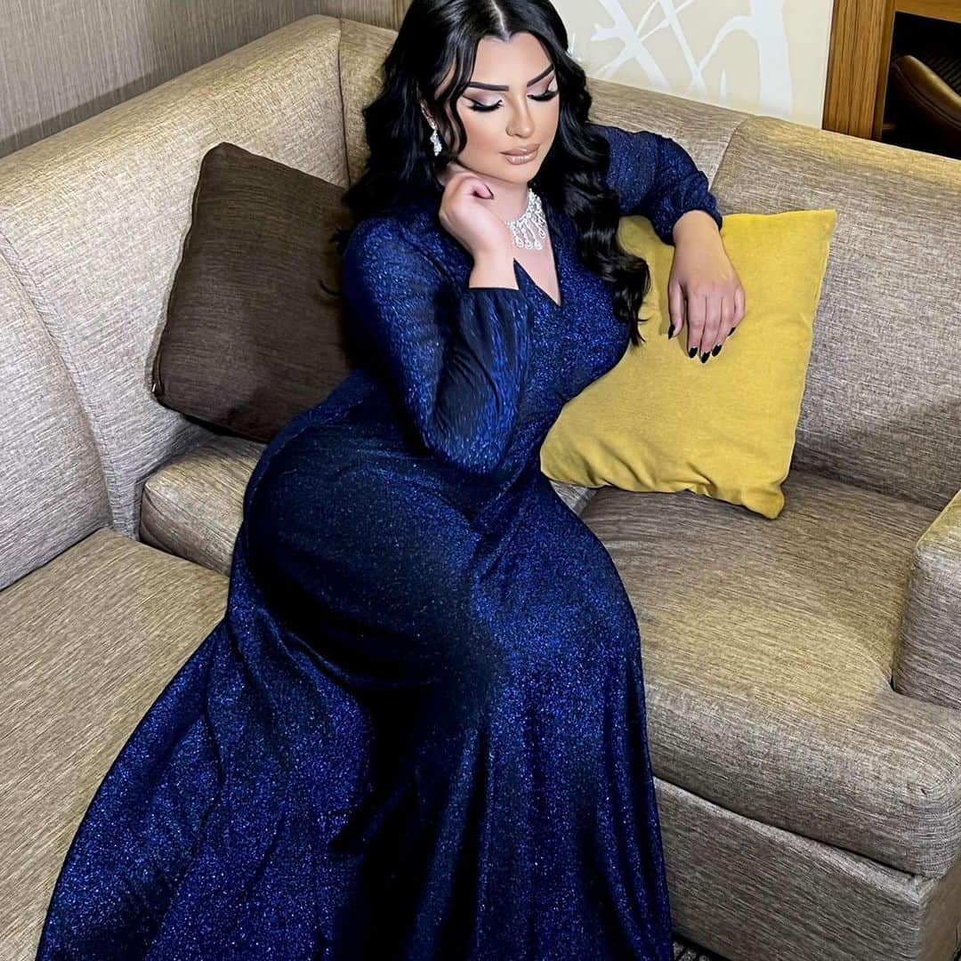 وارتدت أصيل فستاناً كحلياً لامعاً، وتركت شعرها الأسود المموج منسدلاً. مع مكياج هادئ يليق بملامحها.