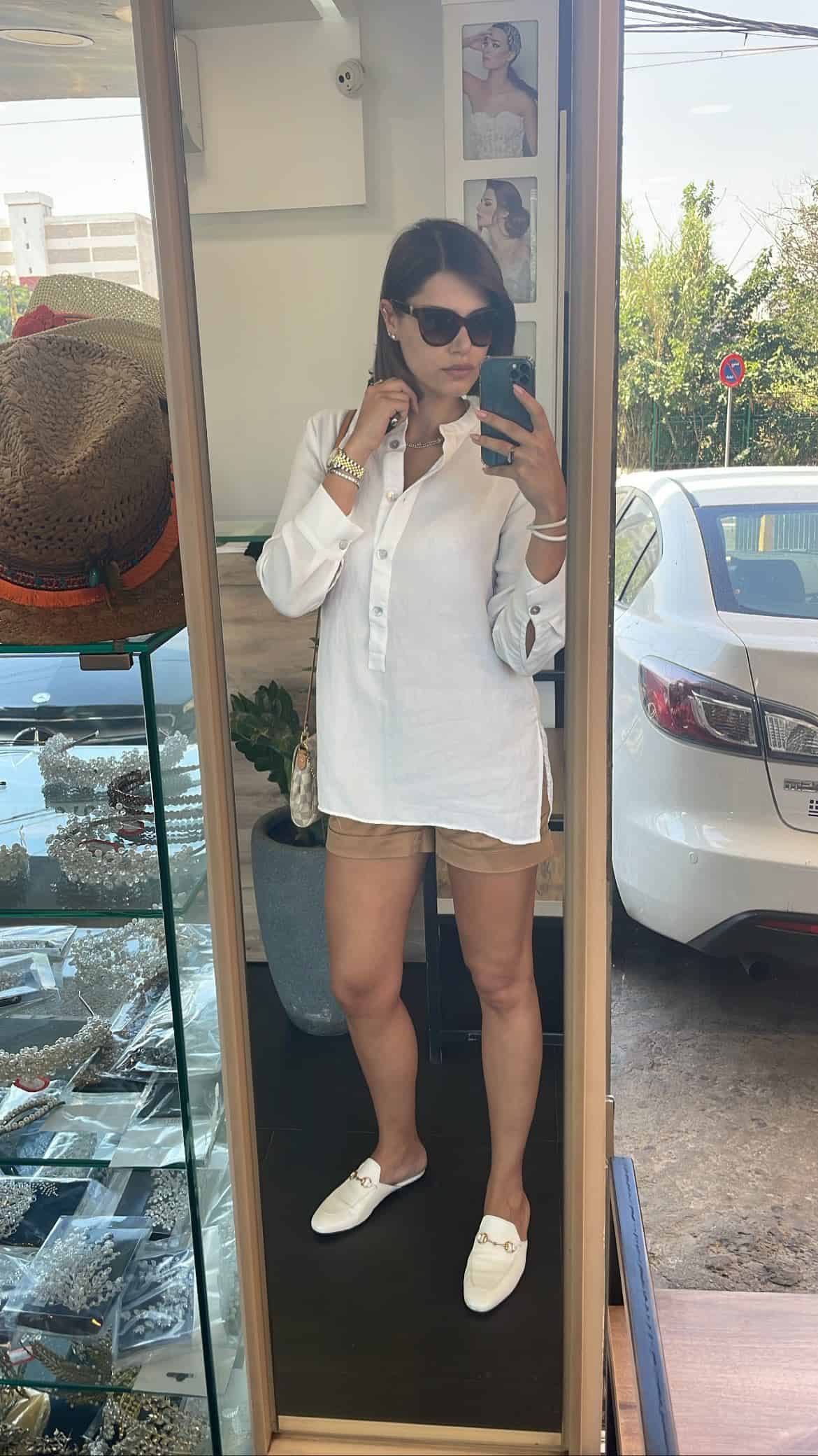 وظهرت نبيلة عواد في الصور والفيديوهات التي شاركتها عبر خاصية “الستوري” في حسابها عبر “انستجرام”، وهي ترتدي قميصاً رسمياً باللون الأبيض مع “هوت شورت” بيج.
