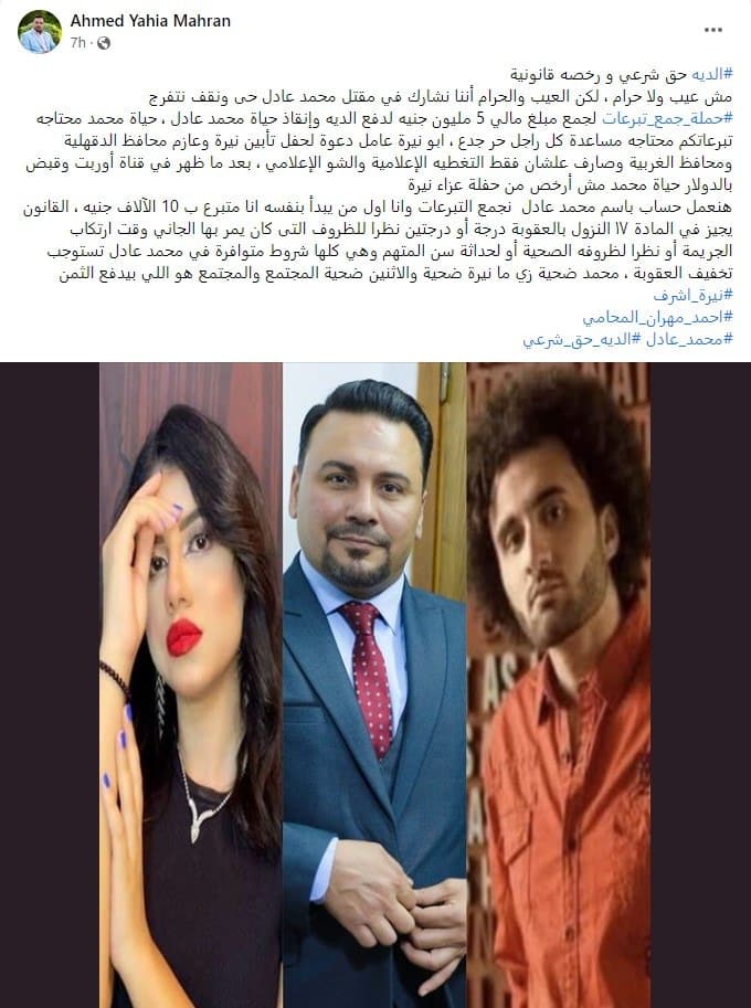 ونشر المحامي المدعو أحمد مهران عبر حسابه الشخصي على فيسبوك الحملة قائلاً: “الدية حق شرعي ورخصة قانونية.. مش عيب ولا حرام، لكن العيب والحرام أننا نشارك في مقتل محمد عادل حي ونقف نتفرج”.