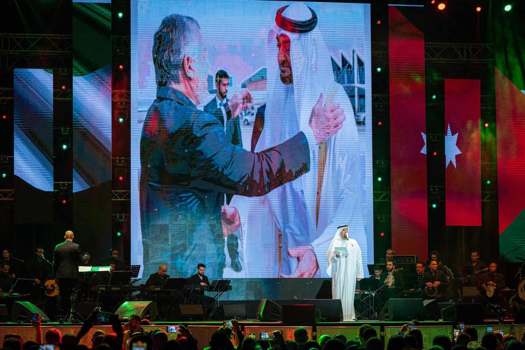 كما أعلن حسين الجسمي خلال الحفل عن تقديم أغنية “حي بالشهامة” عن تقديمه إهداء خاص من الإمارات وشعبها الى الأردن وشعبها، وعرض خلالها على الشاشات صور، محمد بن زايد رئيس الإمارات، والملك عبدالله الثاني بن الحسين ملك الأردن.