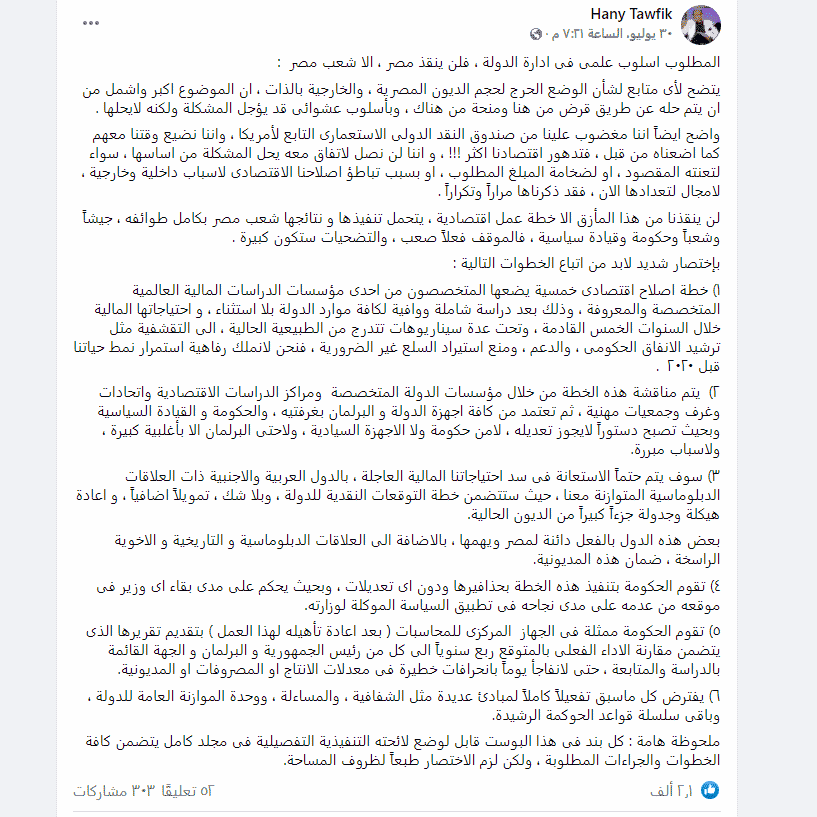 من جانبه قدم الخبير الاقتصادي المصري البارز الدكتور هاني توفيق، للنظام المصري ما وصفه بالحل الأمثل لهذه الأزمة، وقال إن المطلوب أسلوب علمى فى إدارة الدولة. مشددا في الوقت ذاته على أنه لن ينقذ مصر، إلا شعب مصر.