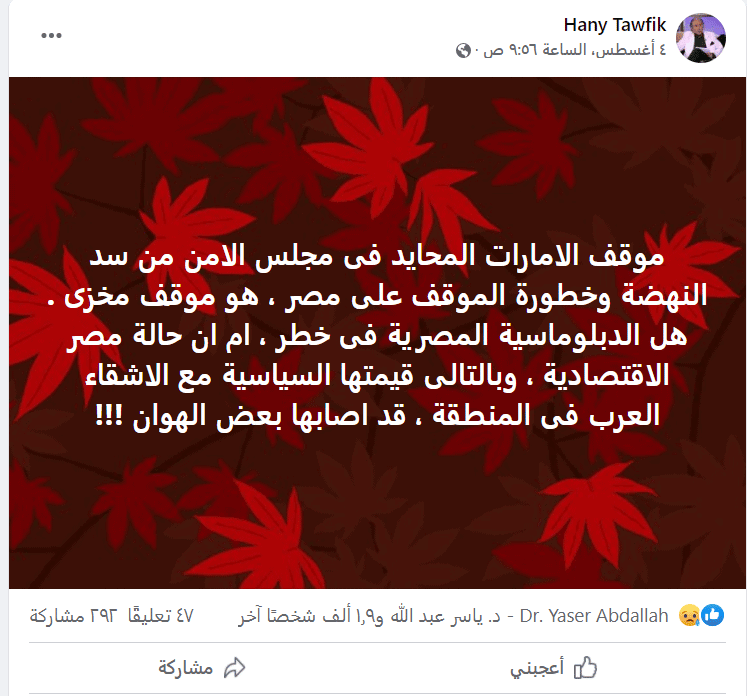 وقال في منشور عبر حسابه الرسمي بفيسبوك رصدته (وطن)، إن موقف الامارات المحايد فى مجلس الأمن من سد النهضة وخطورة الموقف على مصر هو موقف مخزى.