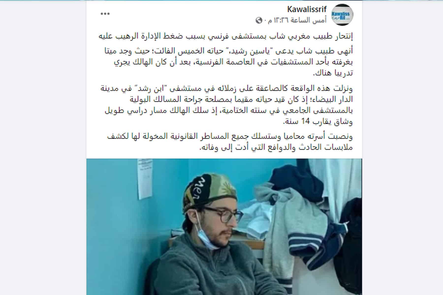 حيث وضع الطبيب ياسين رشيد حدّاً لمسيرة حياته، وأيضا لمسار تكويني ودراسي حافل كطبيب مقيم، عندما عُثر عليه يوم، الخميس 1 سبتمبر، منتحراً شنقاً في غرفته بأحد المستشفيات الفرنسية حيث كان يمضي فترة تدريبية.