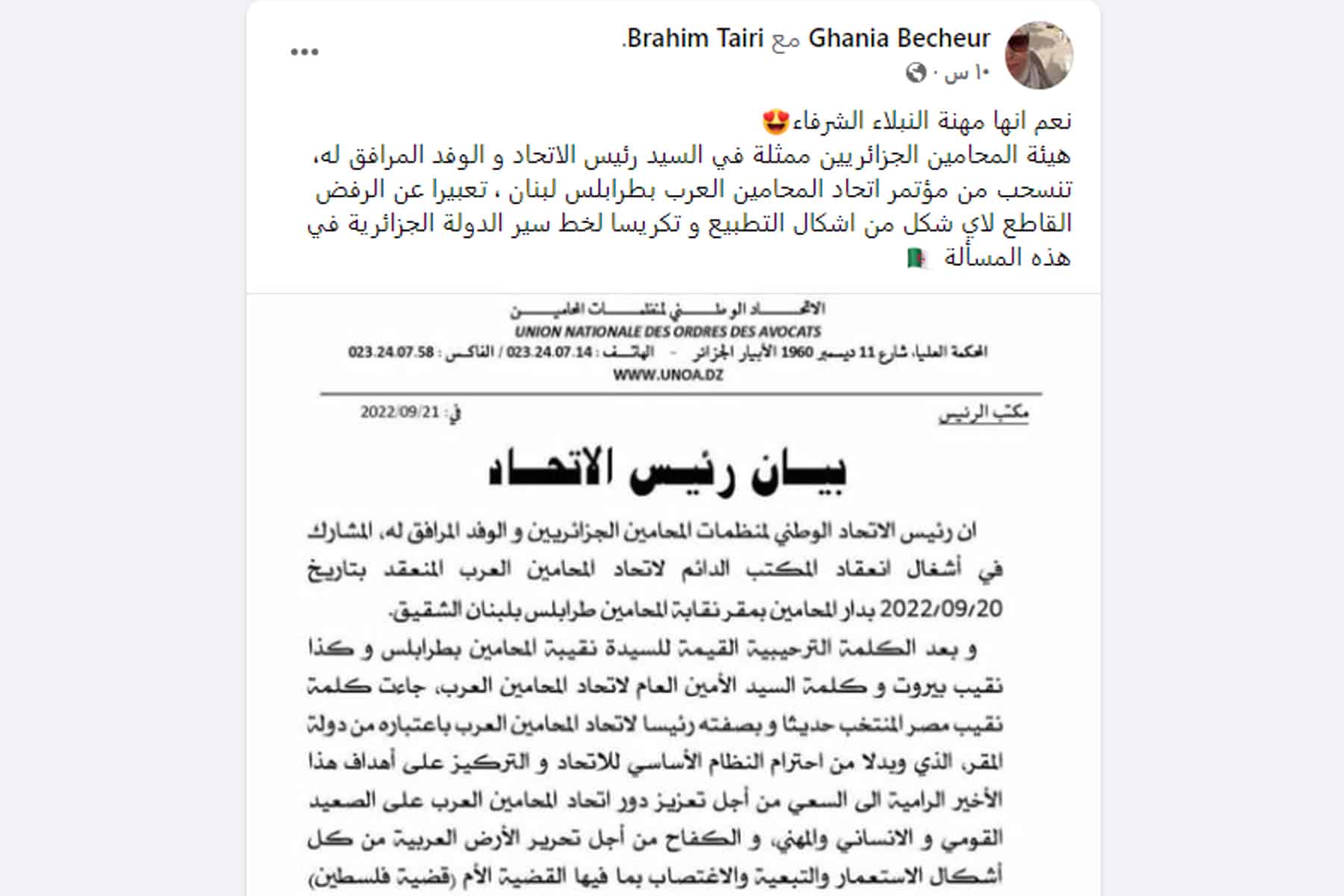وجاء في التدوينة، “نعم إنها مهنة النبلاء الشرفاء.. هيئة المحامين الجزائريين ممثلة في السيد رئيس الاتحاد و الوفد المرافق له، تنسحب من مؤتمر اتحاد المحامين العرب بطرابلس لبنان ، تعبيرا عن الرفض القاطع لأي شكل من أشكال التطبيع و تكريسا لخط سير الدولة الجزائرية في هذه المسألة”.