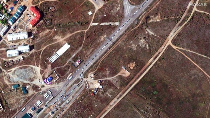 وكشفت الصور التي التقطتها شركة “مكسار تكنولجيز” يوم، الأحد الماضي، عدداً كبيراً من السيارات والعربات تحاول عبور الحدود البرية الروسية في اتجاه جورجيا، عبر معبر “لارس” الحدودي.