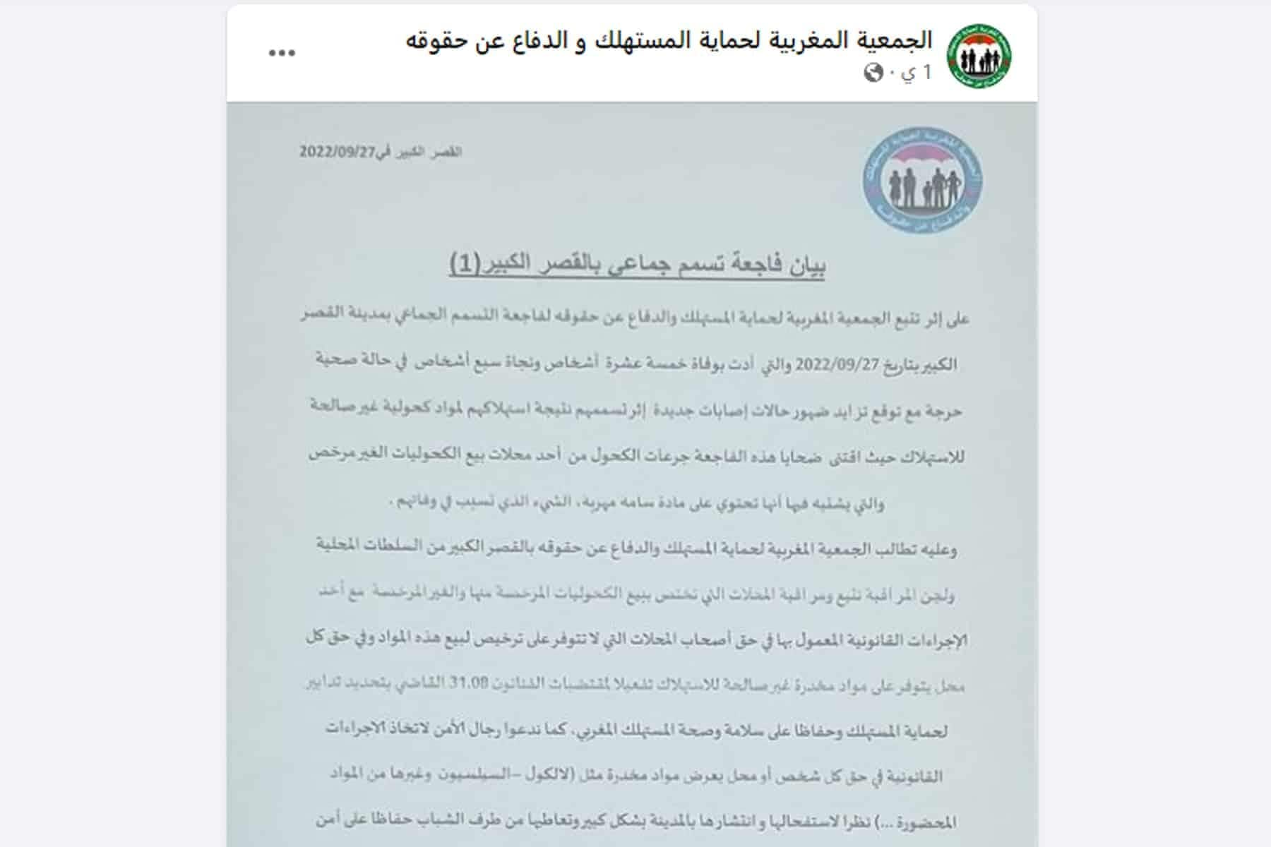 وجاء في بيان المنظمة على لسان رئيسها نور الدين حماتو، “أن الجمعية المغربية لحماية المستهلك والدفاع عن حقوقه تتبعت فاجعة التسمم الجماعي بمدينة القصر الكبير. والتي أدت لوفاة خمسة عشرة أشخاص ونجاة سبع آخرين في حالة صحية حرجة”.