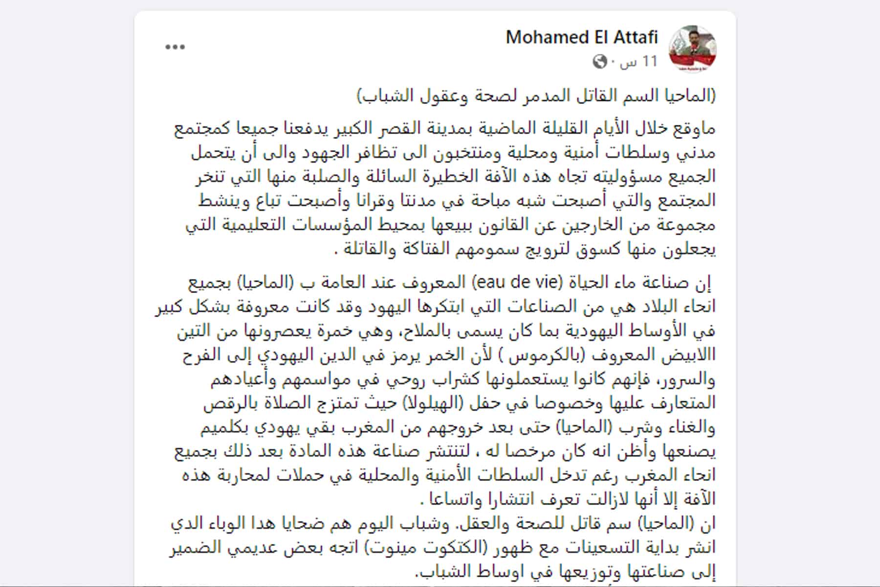 نشر الأستاد الجامعي “محمد العطافي” تدوينة عبر حسابه على موقع فيسبوك، يقول فيها: إن “الكحول مثل الماحيا، هي سم قاتل مدمر لصحة وعقول الشباب في المغرب”.