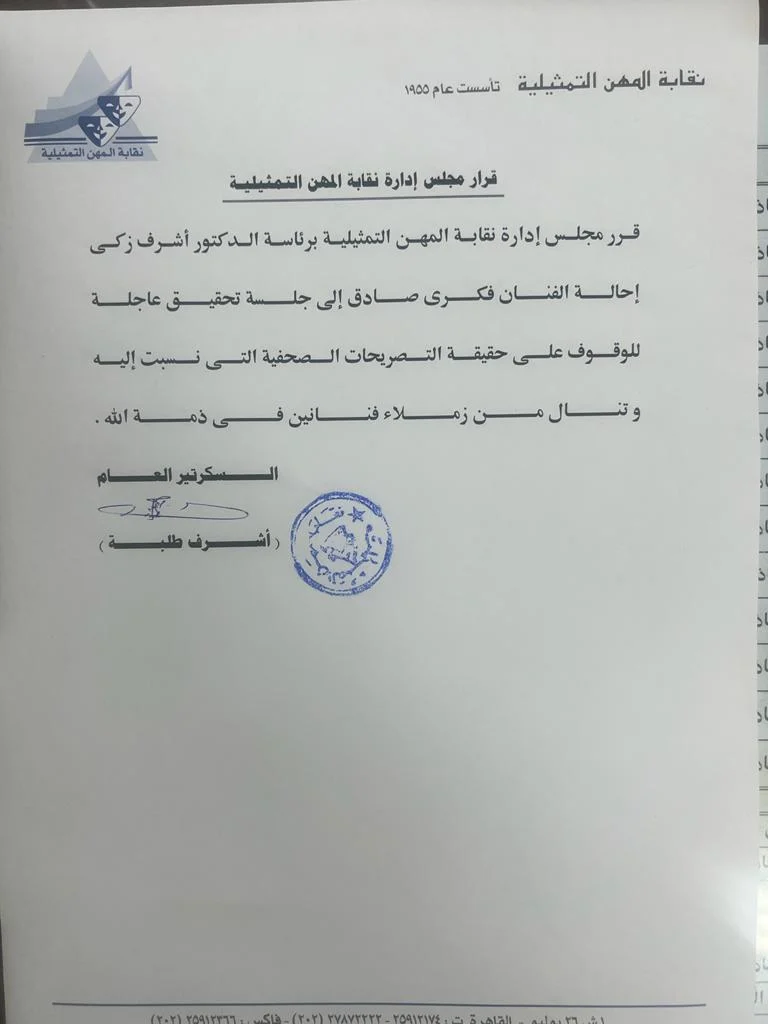 وقرّرت نقابة المهن التمثيلية في مصر، برئاسة الفنان أشرف زكي، تحويلَ فكري صادق إلى التحقيق، بعدما قال في برنامج تلفزيوني، إن سعيد صالح فنان عادي، ويوجد مثله الكثيرون.