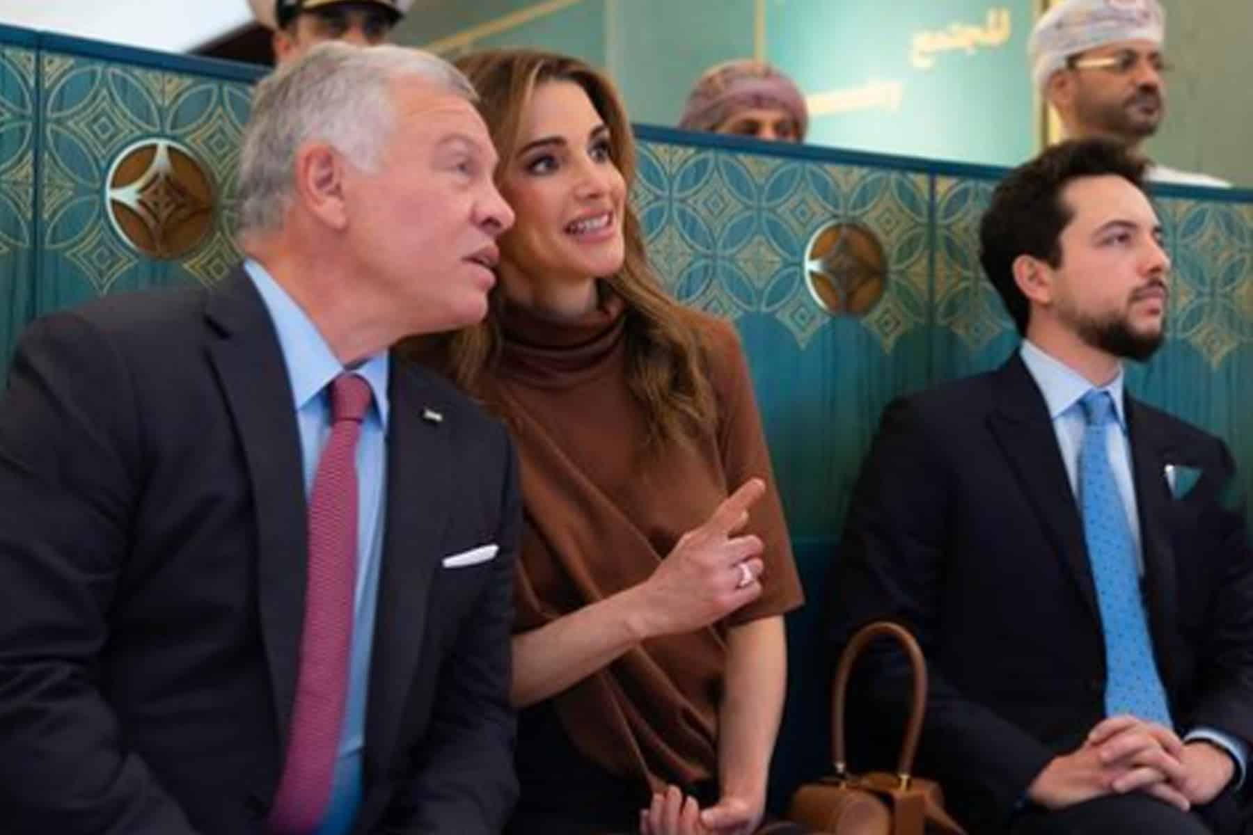فيما ارتدت الملكة رانيا، ملابساً باللون البني مع شنطة يد بنفس اللون، وكانت الابتسامة تعلو وجهيهما.