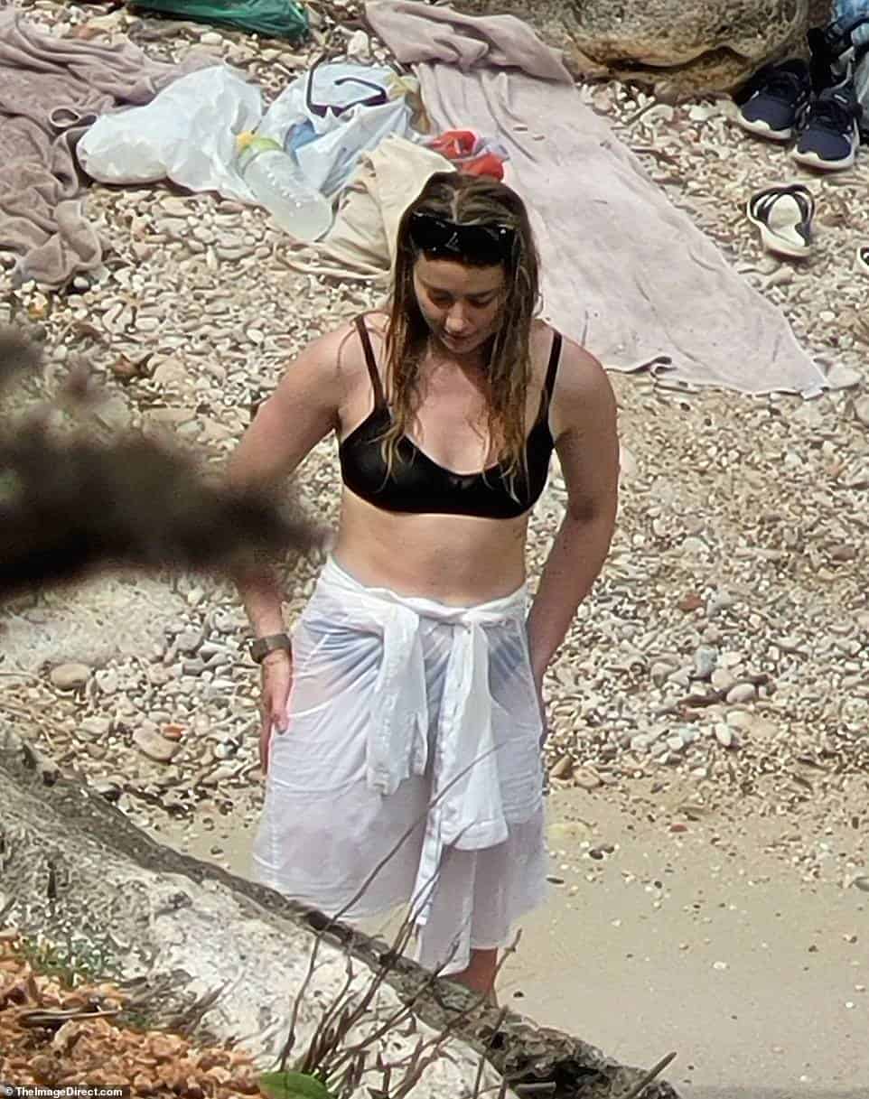 وبينما كانت تلعب بمياه الشاطئ بقدميها، مرتدية بيكيني أسود وتنورة شفافة بيضاء فوقها، ابتسمت نجمة أكوامان البالغة من العمر 36 عاماً. ووضعت يديها على وركيها أثناء تنزهها في شاطئ عام يقع بين منحدرات صخرية طويلة.