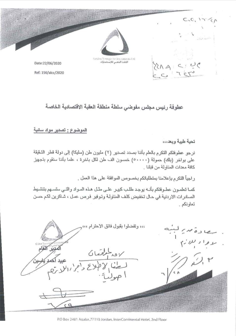 الوثائق التي حصلت عليها “وطن”، كشفت عن مخاطبة شركة المثلث الذهبي ومقرُّها مدينة العقبة، شركةَ العقبة لإدارة وتشغيل الموانئ لتحديدِ رصيف لتحميل أول شحنات تصدير مادة السيليكا (الرمل الزجاجي) لدولة قطر، مع التزام الشركة المصدرة تجهيز معدات المناولة والشحن.