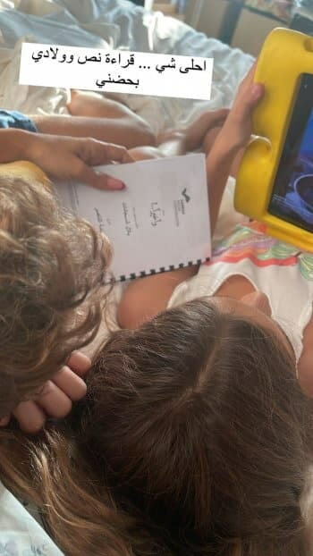وعلقت نادين: “احلى شي … قراءة نص وولادي بحضني. شكراً يا رب على هل النعمة”.