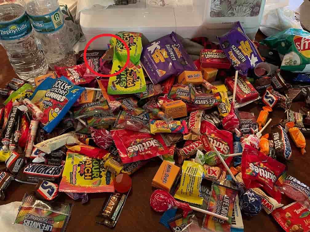 يمكنك أن ترى مشهداً يبدو مغرياً، حيث يوجد الكثير من الحلويات اللذيذة المنتشرة حولها، لديك سنيكرز، سكيتلز، كرات الجبن، جولي رانشرز، تويكس، ميلك دودز، وما إلى ذلك.