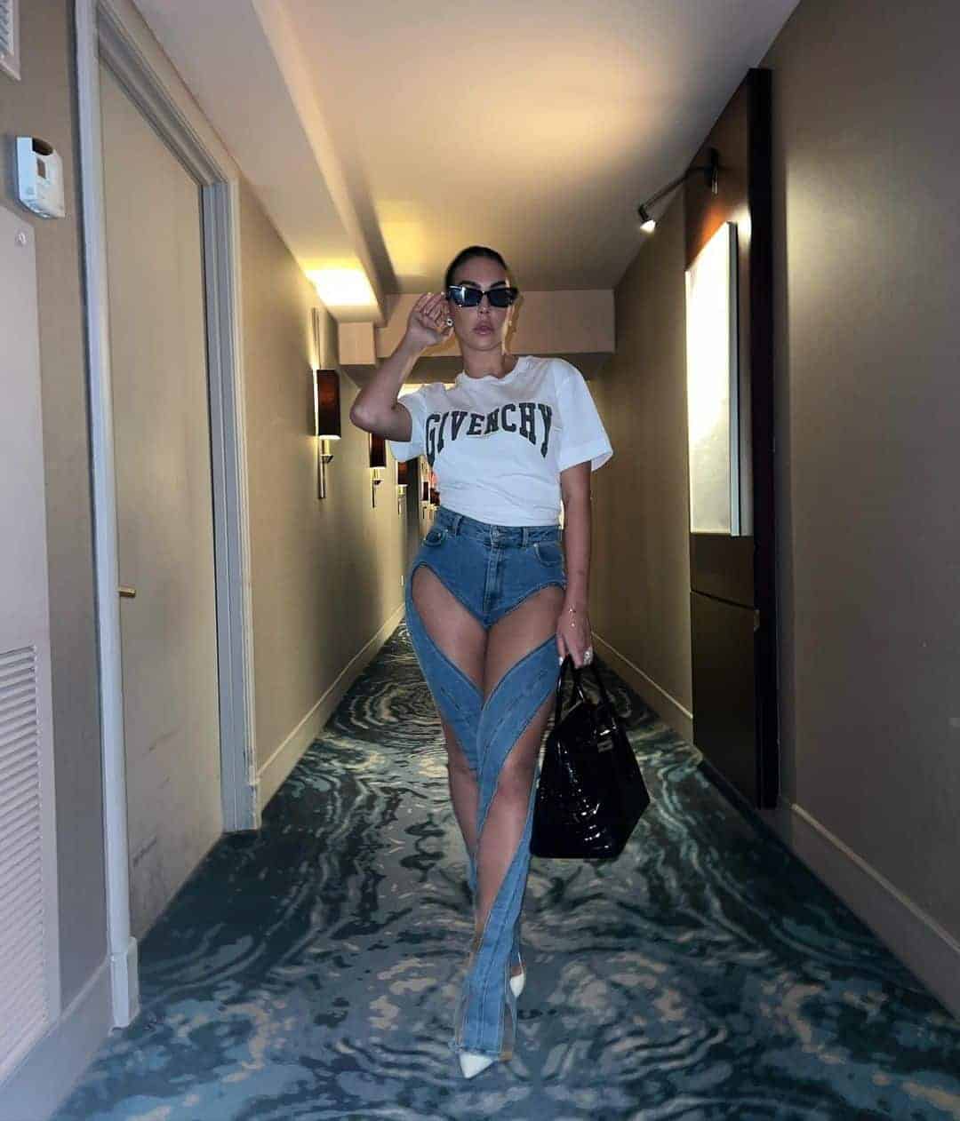 وظهرت جورجينا رودريغيز في الصورة التي تركتها بدون تعليق، عبر حسابها على “انستجرام”، ببنطال جينز أزرق، يتميز بفتحاته الكثيرة، ويكشف أكثر مما يغطي.