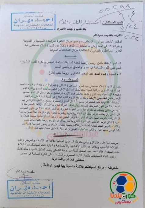 حيث اتهم الزوج “إسلام مصطفى” خلال المقطع، زوجتَه التي ذكر اسمها “هناء أحمد الشناوي” بممارسة “الزنا” مع رئيس لجنة المسابقات والمسؤول عن الكرة النسائية في الاتحاد المصري لكرة القدم.