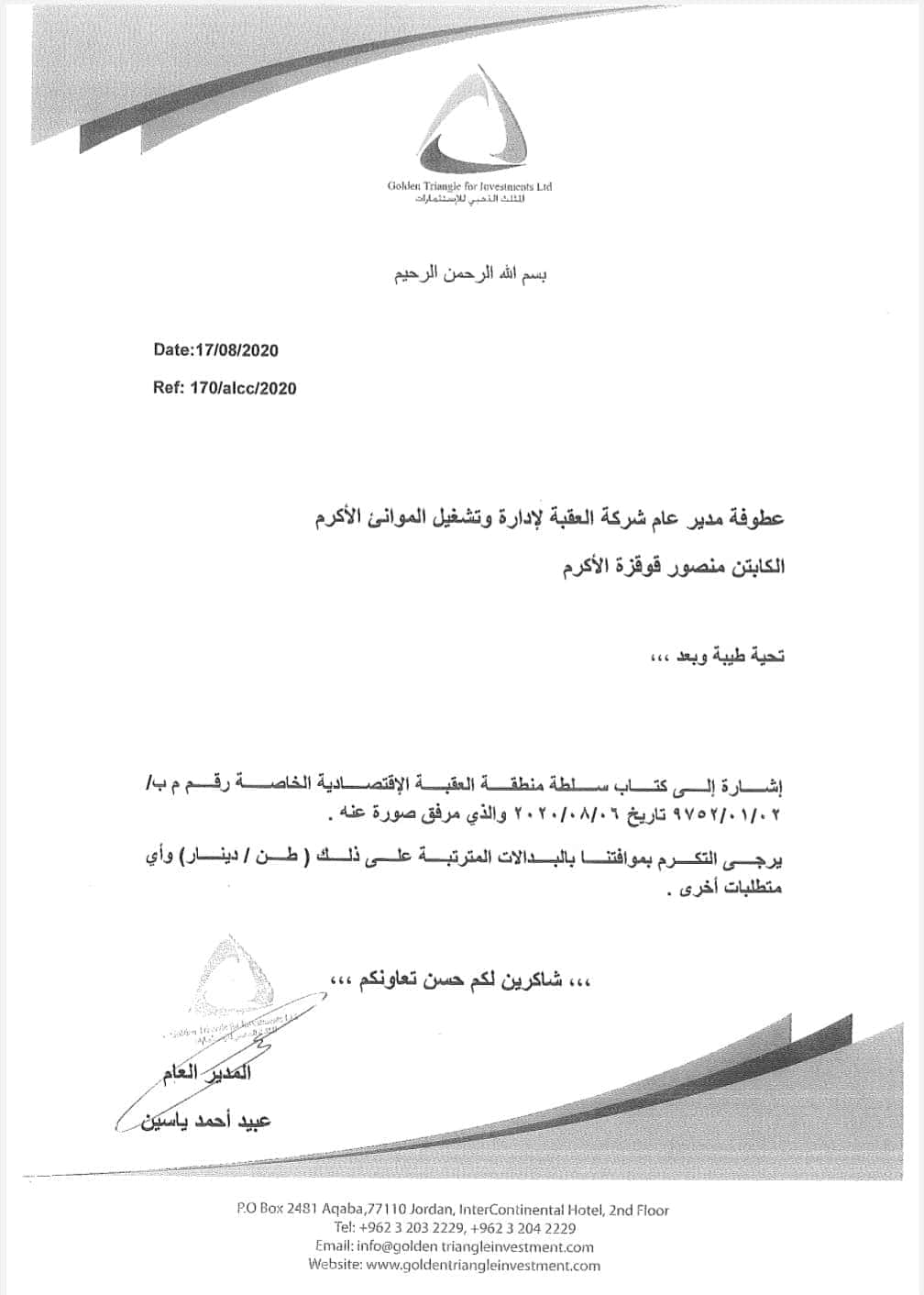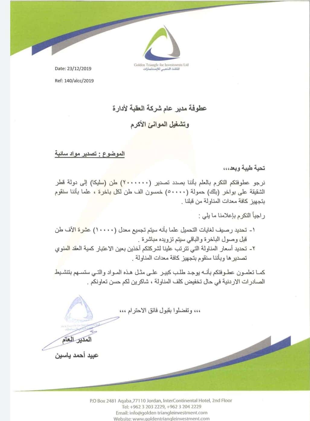 الوثائق التي حصلت عليها “وطن”، كشفت عن مخاطبة شركة المثلث الذهبي ومقرُّها مدينة العقبة، شركةَ العقبة لإدارة وتشغيل الموانئ لتحديدِ رصيف لتحميل أول شحنات تصدير مادة السيليكا (الرمل الزجاجي) لدولة قطر، مع التزام الشركة المصدرة تجهيز معدات المناولة والشحن.