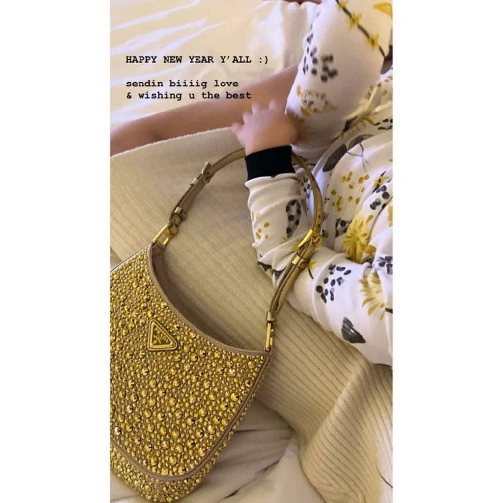 ارتدت خاي بيجاما سوداء وأمسكت بحقيبة ذهبية كبيرة من Prada Cleo مزينة بالكريستال، ويبلغ سعرها (3700 دولار).