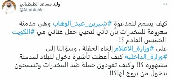 وفي تغريدة له عبر “تويتر“، تساءل وليد مساعد الطبطبائي: “كيف يسمح للمدعوة #شيرين_عبد_الوهاب وهي مدمنة معروفة للمخدرات بأن تأتي لتحيي حفل غنائي في #الكويت الخميس القادم ؟!”.