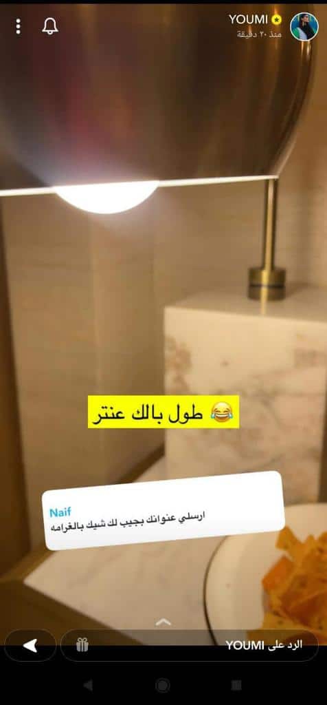 كما أن يومي ردت على متابع طلب منها عنوانها ليرسل لها قيمة الغرامة المفروضة عليها. فردت ساخرة: “طول بالك يا عنتر”.