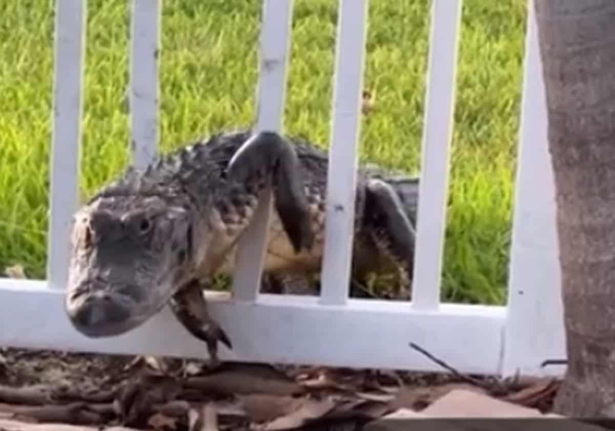 وطن- صدم رجل أمريكي من ولاية فلوريدا لرؤية تمساح ضخم، وهو يحاول الدخول إلى منزله من خلال سياج الفناء الخلفي، الذي اخترقه التمساح.