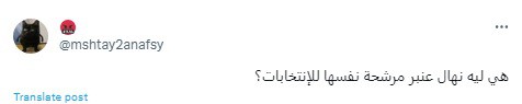 وغرد ناشط: “هي ليه نهال عنبر مرشحة نفسها للإنتخابات؟”.