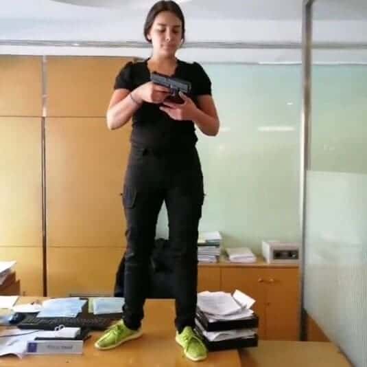 وصعدت سالي على أحد المكاتب وفي يدها السلاح، مهددة بإطلاق النار.