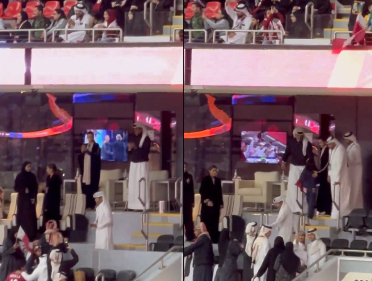 وأظهر مقطع فيديو متداول الأمير تميم بن حمد، وهو يجلس أعلى المنصة المخصصة للعائلة الحاكمة، وعند فوز منتخب قطر وقف ليصفق بحرارة إلى جانب ابنته.