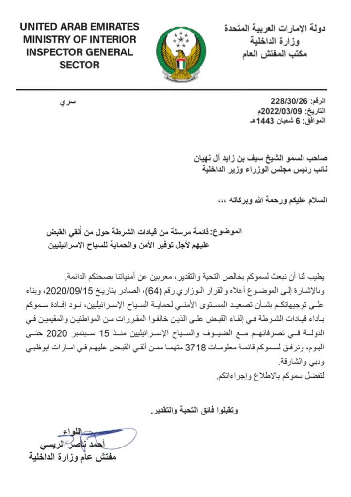 وتتعلق الوثيقة وفق ما هو منشور بموضوع قائمة قيادات الشرطة الإماراتية حول من ألقي القبض عليهم لأجل توفير الأمن والحماية للسياح الإسرائيليين.