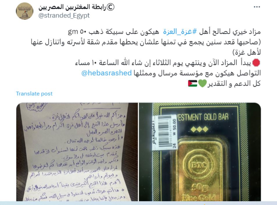 The “Egyptian Expatriates Association” Facebook page posted two pictures of the donation message and the donated 50-gram gold ingot, with the caption: “Charity auction for the honorable people of Gaza on a 50g gold ingot.”