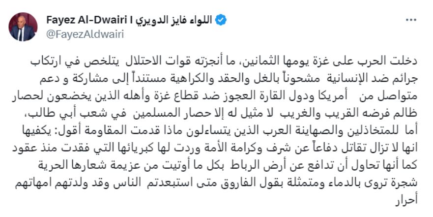 Brigadier General Fayez al-Duwairi, described by activists as causing a ‘headache for Israel’ due to his realistic and accurate analyses exposing the vulnerability and defeat of the Israeli army, tweeted on his former “X” Twitter account on Monday: “The war on Gaza has entered its eightieth day. What the occupation forces have accomplished can be summed up in committing crimes against humanity fueled by malice, hatred, and animosity, relying on continuous participation and support from America and the old continent’s countries against the Gaza Strip and its people, who are subjected to a ruthless siege imposed by near and far powers, unprecedented except for the siege of Muslims in the People of Abu Talib.”