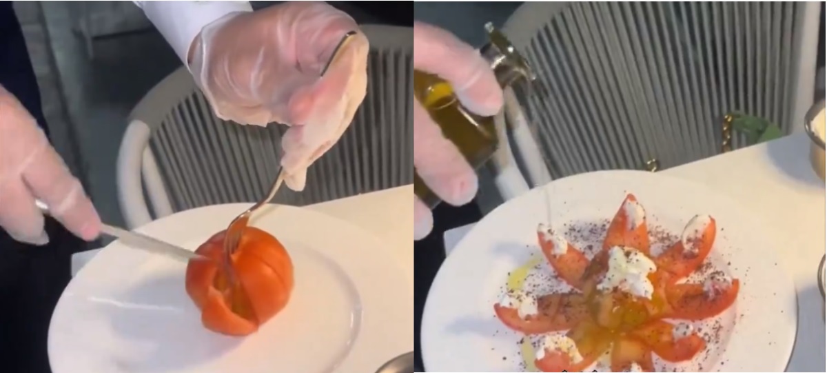 In the circulated video, a restaurant waiter is seen cutting the tomato into long slices in a distinctive manner, arranging them to resemble an octopus. He then adds a type of white cream, spices, and drizzles a bit of olive oil on top.