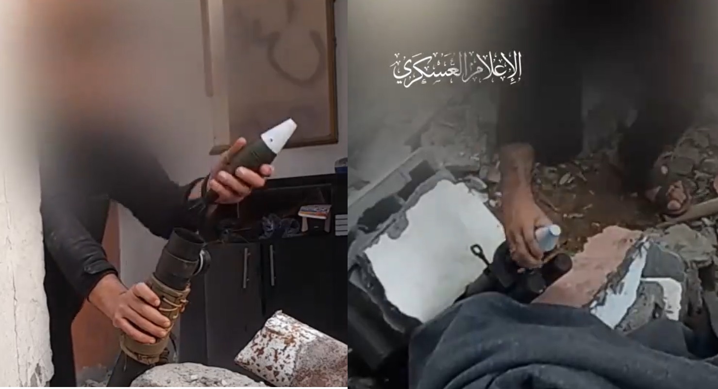 In one scene, a Al-Qassam resistance member is seen firing multiple consecutive mortar shells from a launcher next to a tree. In another scene, another fighter inside an office is seen loading a launcher with more shells.