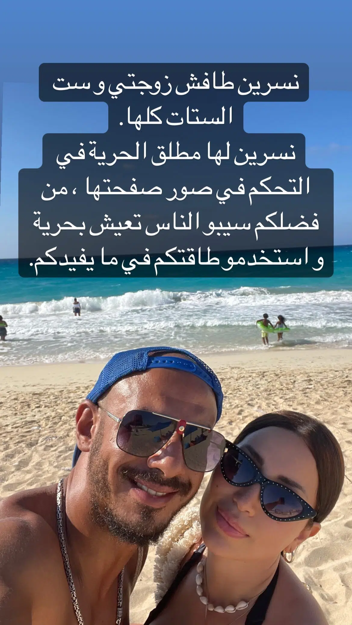 وكتب شرقاوي: “نسرين طافش زوجتي وست الستات كلها، نسرين لها مطلق الحرية في التحكم في صور صفحتها. من فضلكم سيبوا الناس تعيش بحرية، واستخدموا طاقتكم فيما يفيدكم”.