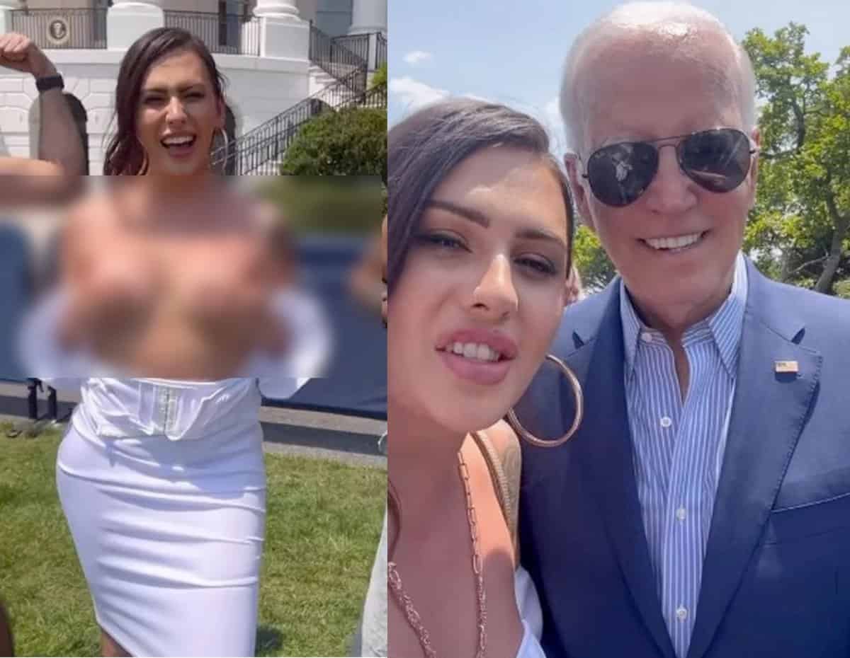 عارضة أزياء متحولة جنسياً تكشف ثدييها بعد التقاط صورة مع جو بايدن مباشرة! (شاهد)